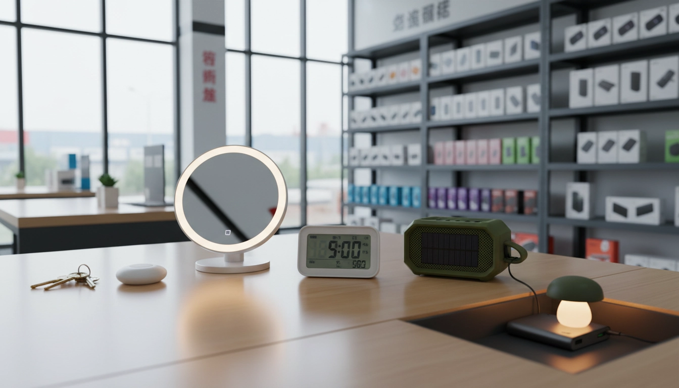 These have become a staple in Yiwu’s home & beauty sections. A compact mirror with built-in LEDs around the edge, offering 2–3 color temperatures (warm, neutral, cool).